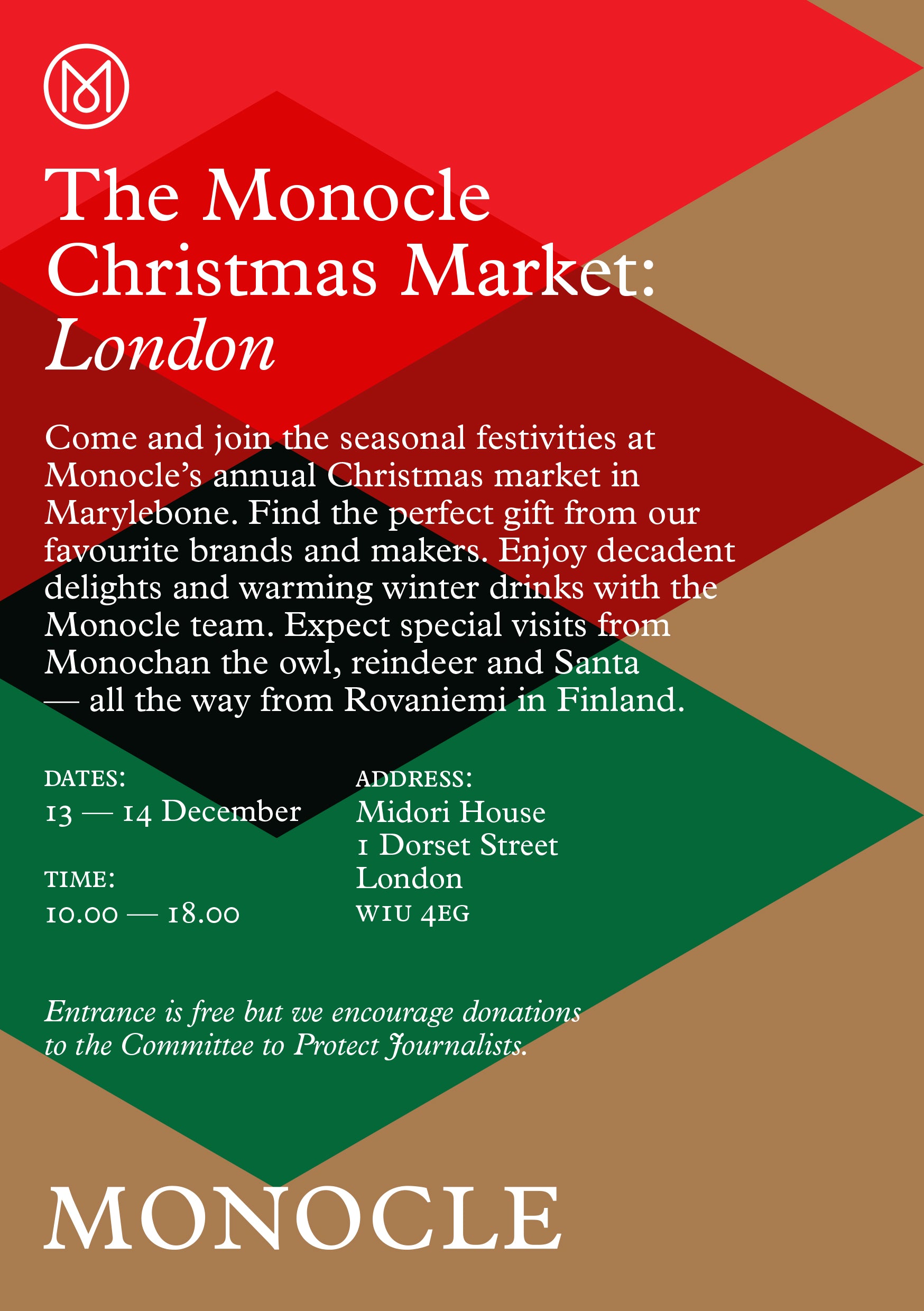 Join Trunk at Monocle’s annual Christmas Market at their Midori House HQ. Discover the perfect gift from a curated selection of Monocle’s favourite brands and makers while enjoying decadent treats and warming winter drinks with the Monocle team. We’ll be bringing a range of our best seasonal gifts, from cosy knitwear and accessories to lifestyle goods and more. See you there!