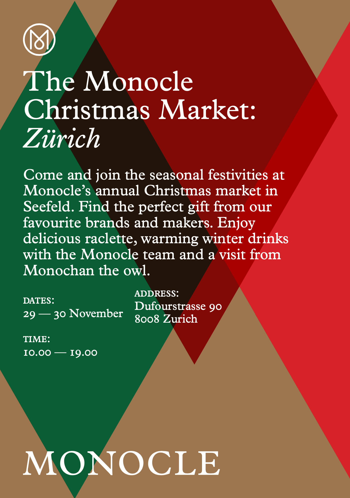 Join us for The Monocle and Trunk Christmas Market in Zürich. Explore our seasonal favourites at Trunk, including soft knits, winter-ready jackets, and timeless accessories — along with a curated selection of Monocle and Trunk's favourite international brands.