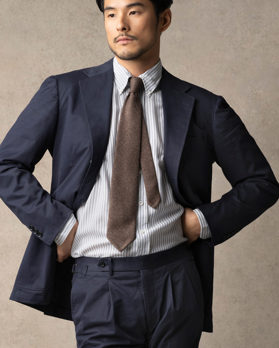 Made from a refined blend of wool, cotton and cashmere, this tie brings soft texture and subtle warmth to autumn and winter dressing. Its durable twill weave holds a smart knot while feeling comfortable throughout the day. A simple way to elevate business or formal outfits, it adds quiet elegance and seasonal depth to tailored jackets and crisp shirts.