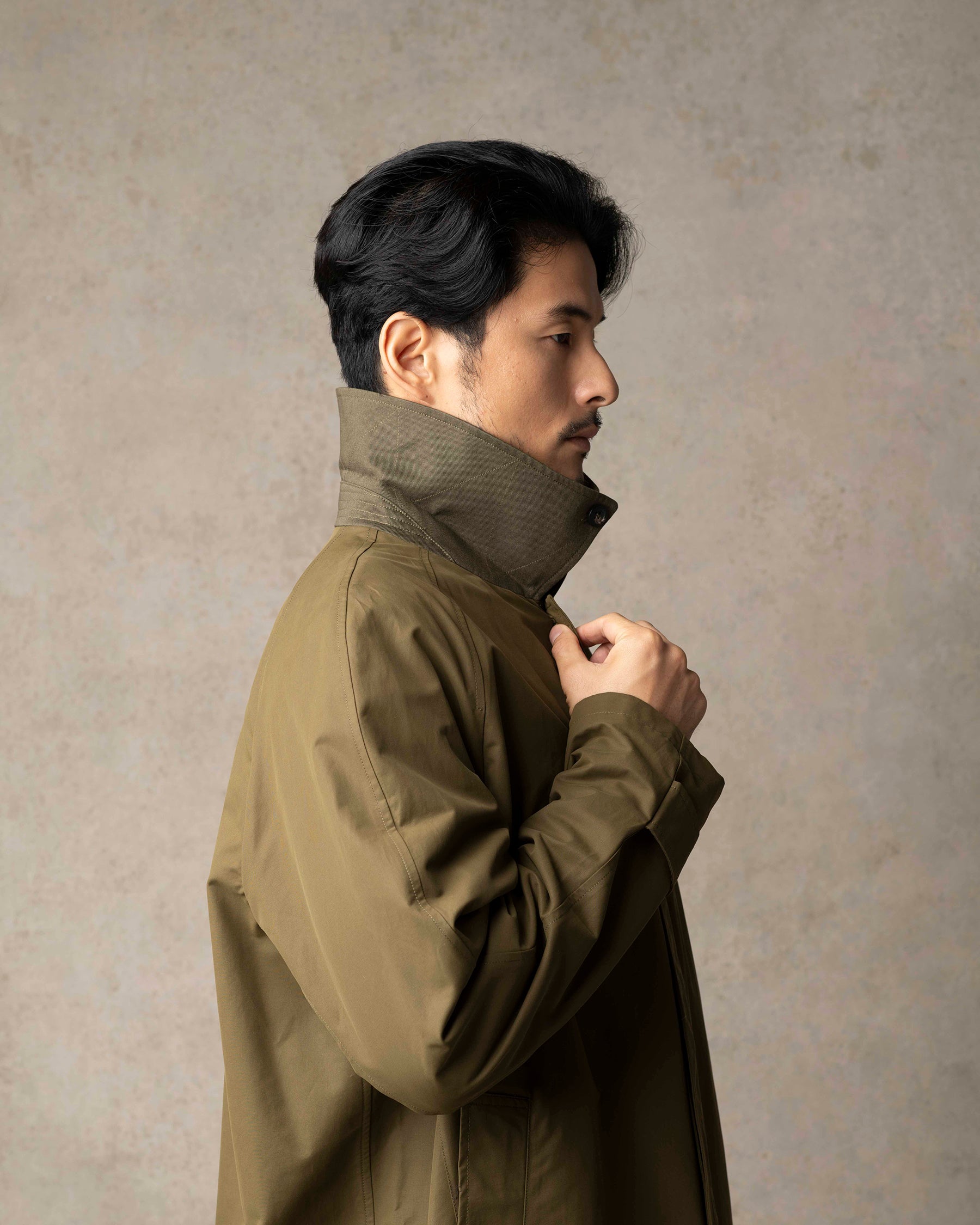 This Italian-crafted raincoat from our in-house Trunk line combines technical performance with everyday wearability. Its A-line fit and raglan sleeves allow freedom of movement, while the half-lined construction keeps it light enough to layer over a suit or knitwear. Made from Olmetex cotton-blend fabric, it’s showerproof, wind-resistant, and designed to keep you comfortable in unpredictable weather.