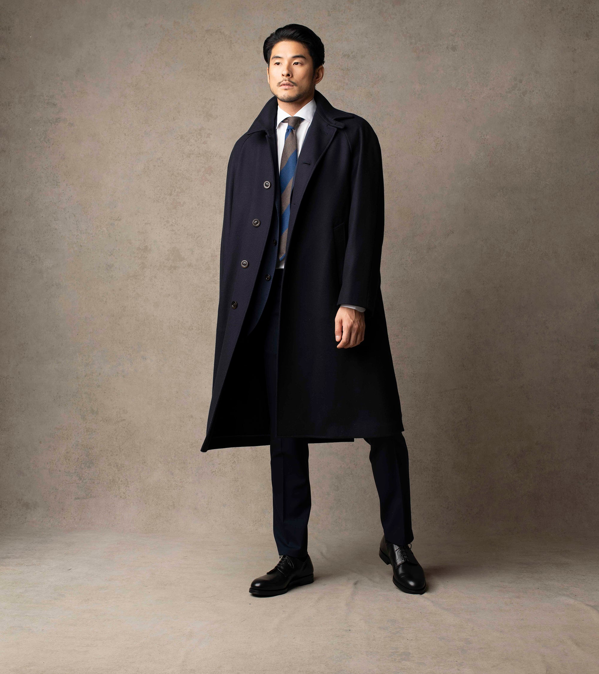 The Trunk Devonshire overcoat remains our standout investment piece of outerwear. Made in Italy from plain-weave wool by Yorkshire mill Abraham Moon, it’s lighter and more versatile than many traditional overcoats while maintaining a subtle sheen. Inspired by the classic Balmacaan, its A-line silhouette and soft raglan shoulders allow for winter layering and tailoring, with a length just above the knee for a modern touch.