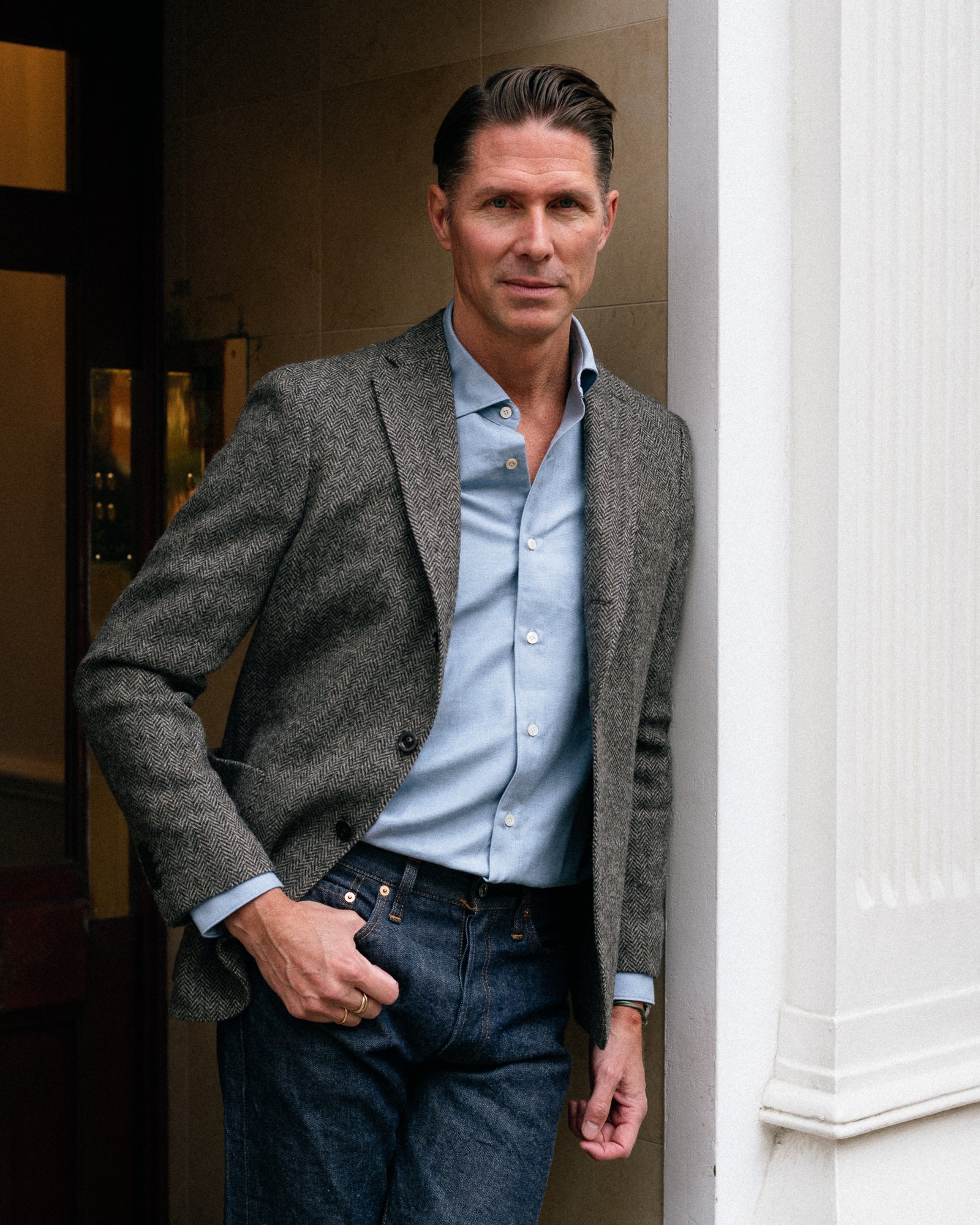 Mats wears a Boglioli K-Jacket made from a seasonal wool herringbone fabric.