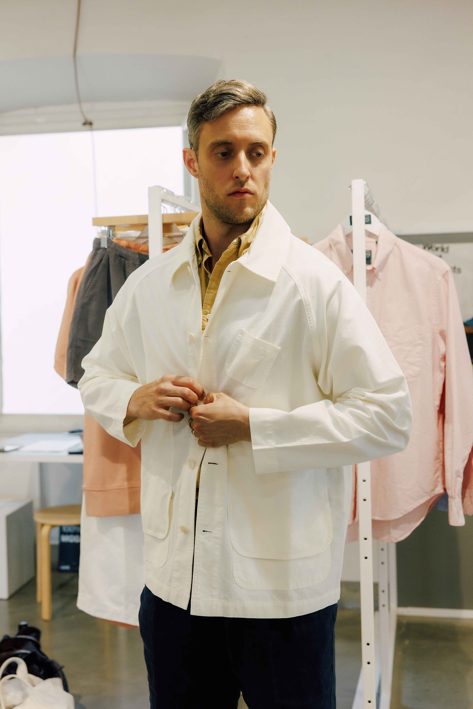 The brand took off. But rather than simply offer beachwear, André and José decided that La Paz should update the summer menswear staples with a contemporary flair, with fabrication — drawing back to Portugal’s manufacturing prowess — being key. Tailored shorts with an elasticated waist, akin to those worn in school gym class, are unexpectedly rendered in crisp corduroy, giving them versatility and making them as appropriate worn on hot days in a city as at the beach. Simple pullover sweatshirts that would usually be crafted from cotton jersey are instead made from a fuzzy towelling, which adds texture and depth and conjures imagery of a much-loved beach towel. “We invest a lot in texture and fabric research as this is what gives a special touch to our range,” says José. “It gives a new approach to a classic piece.” Short-sleeved shirts come in ticking stripes, naturally crafted from Portuguese cotton.