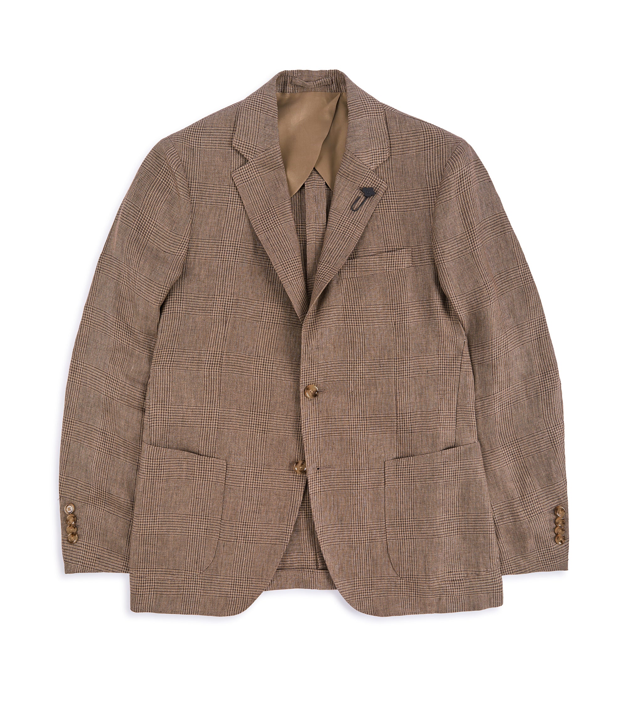The Lardini Linen Prince of Wales Check Jacket combines distinctive elegance with comfort. Made from exclusive linen fabric in a unique glen plaid pattern, this single-breasted blazer features a classic lapel, two buttons, and patch pockets. Its regular-fit and natural shoulder provide a rounded look for a polished, formal look. Perfect for those seeking a sophisticated and comfortable style.
