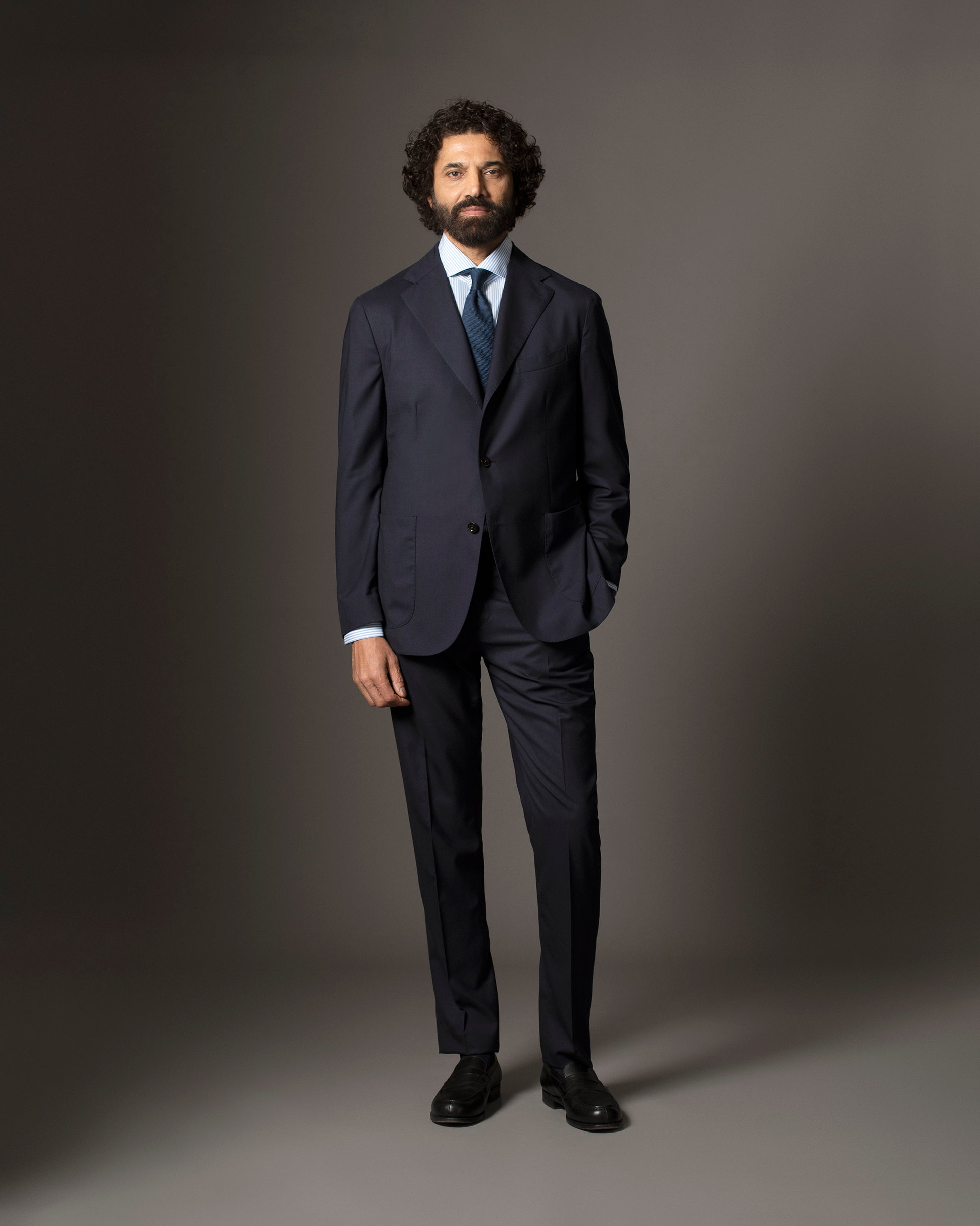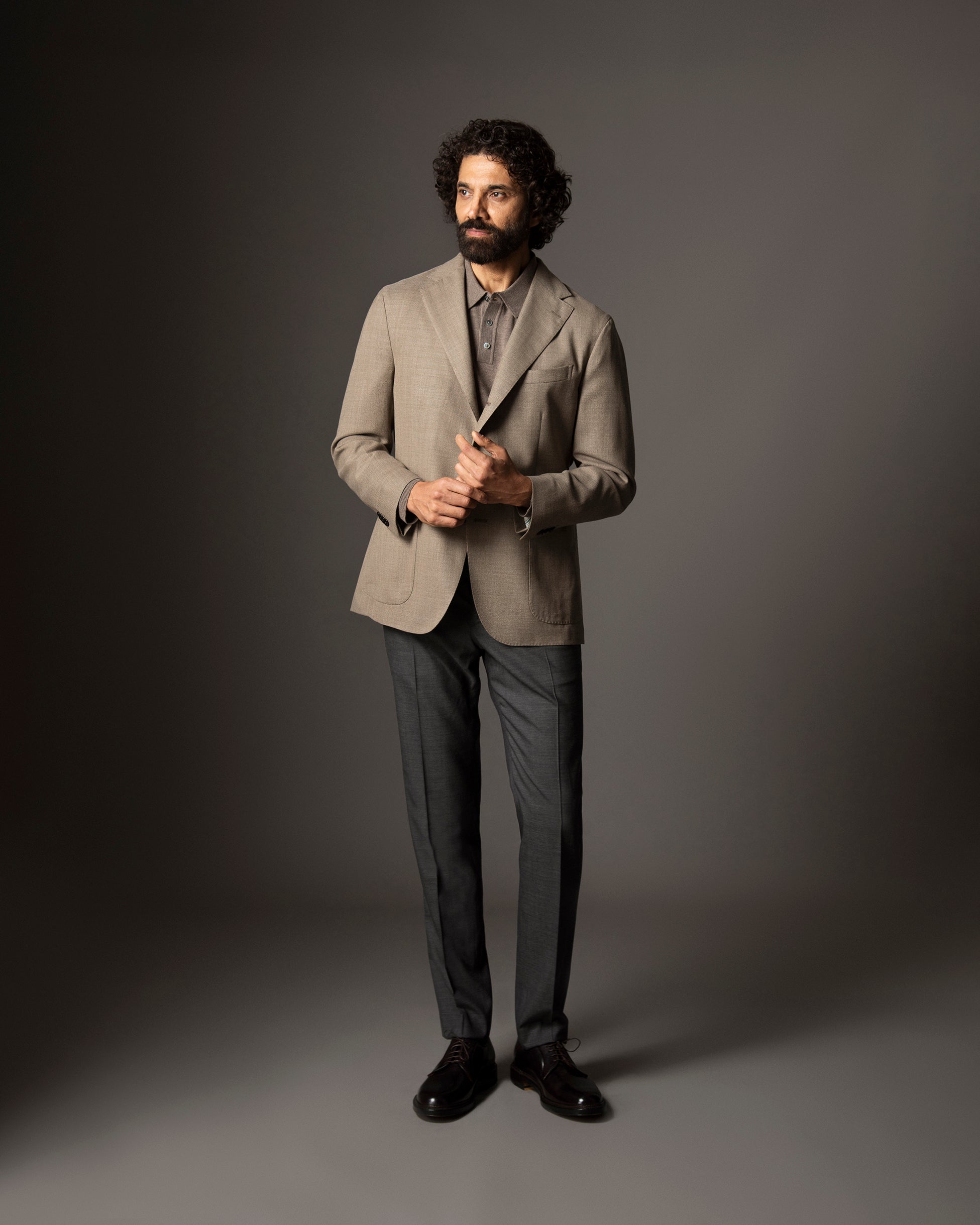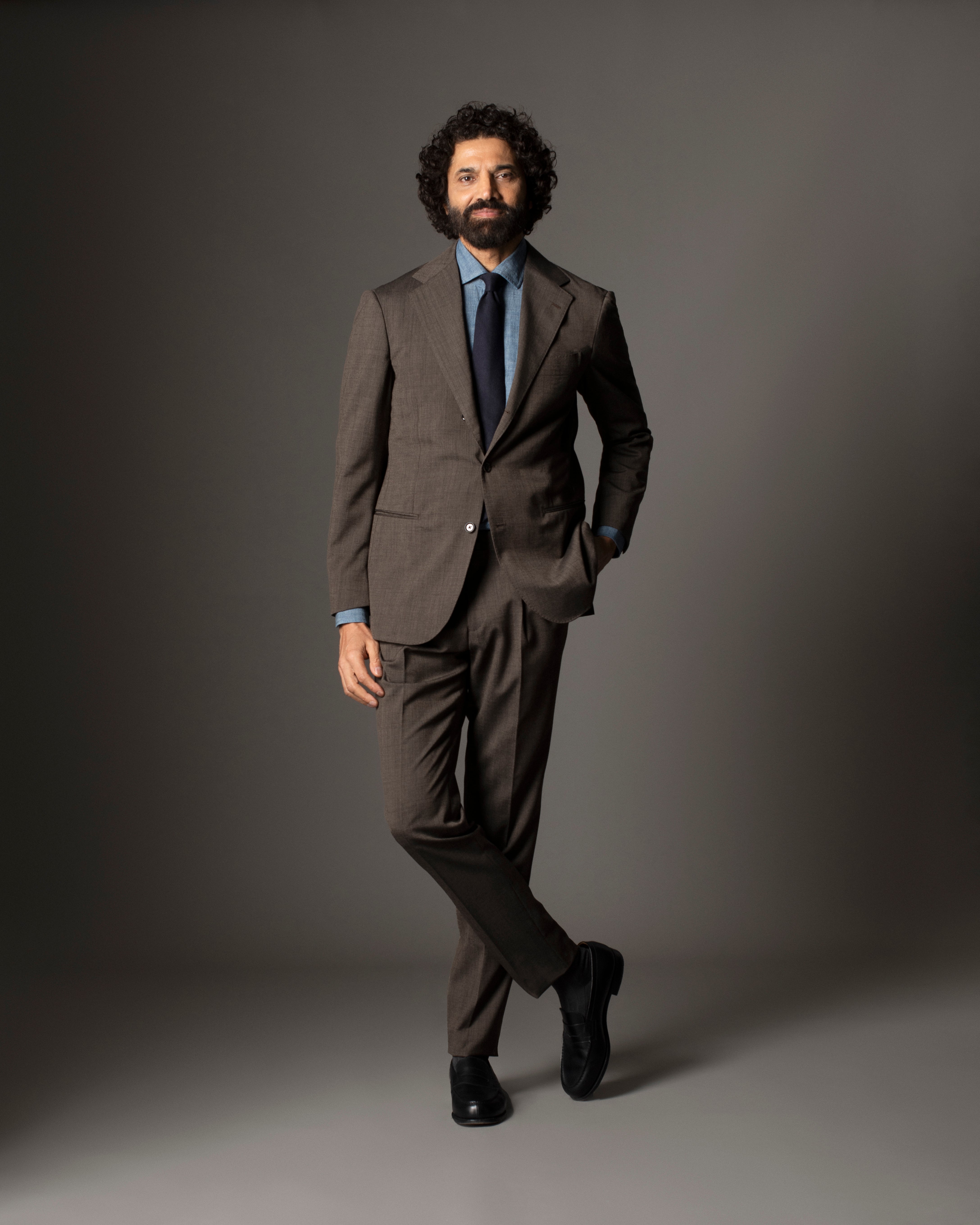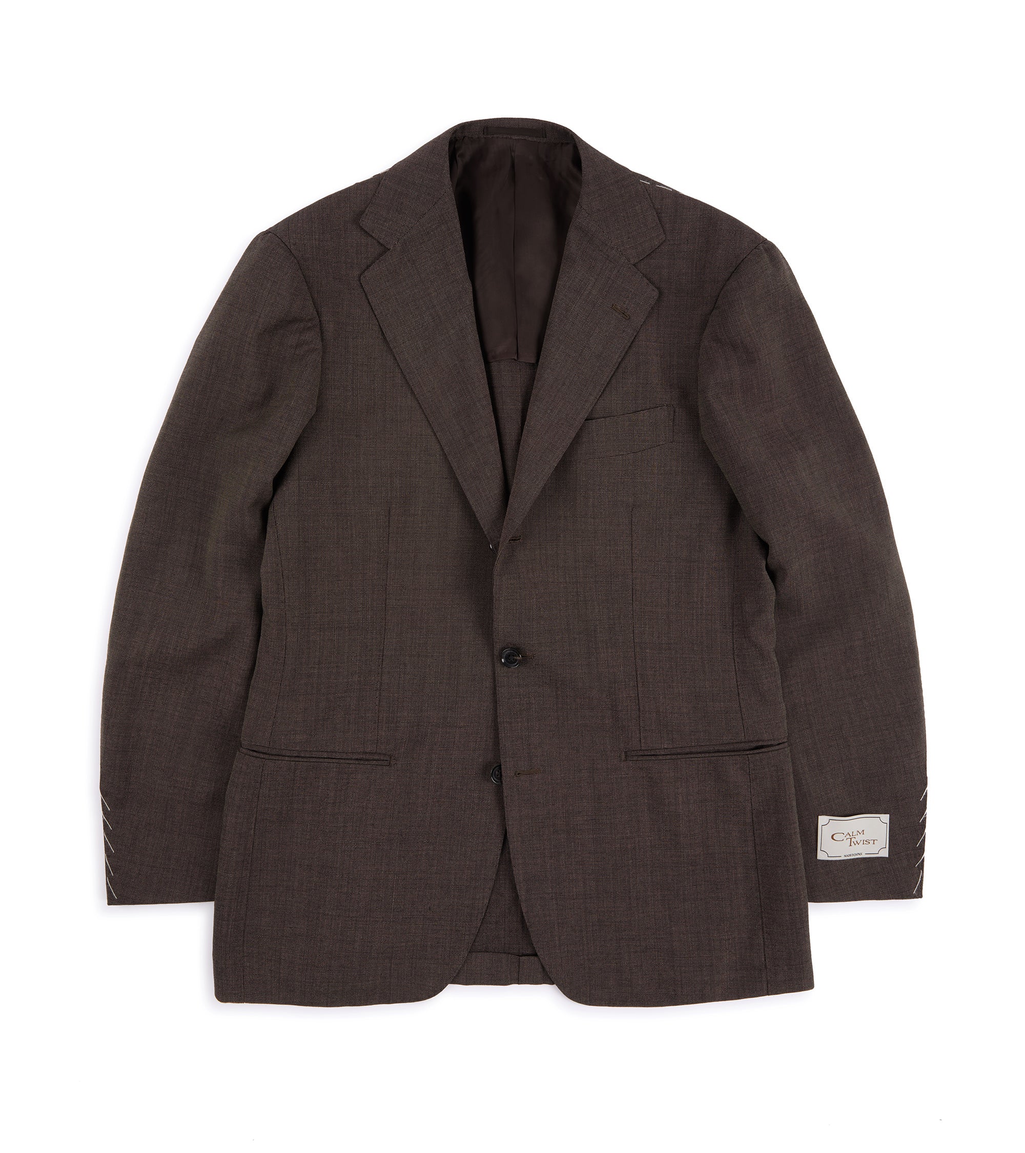 Crafted from Ring Jacket's exclusive Calm Twist wool fabric, renowned for its exceptional crease resistance and effortless drape, this brown suit epitomises the brand's commitment to high-quality ready-to-wear tailoring. Expertly tailored in the brand's workshop in Osaka, Japan, it boasts a flattering silhouette inspired by Neapolitan tailoring. As part of the brand's “Meister” line, the suit features extensive handwork and bespoke-level finishes, including a soft canvas construction with gently shaped shoulders, a draped chest, and a smooth taper to the waist, all complemented by 3-roll-2 wide, rolling lapels. The trousers, meanwhile, feature a single pleat, belt loops, and a three-point fastening.